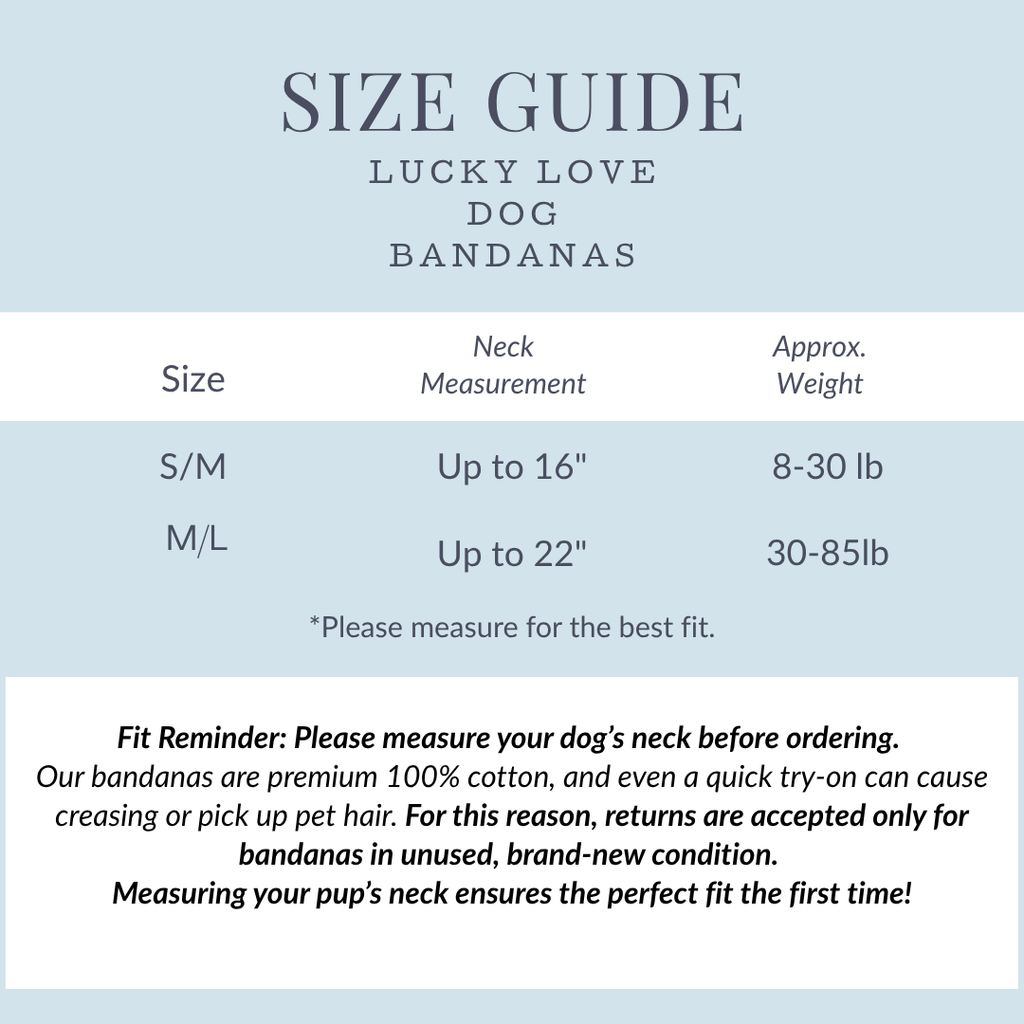 Returns:Our bandanas are premium 100% cotton, and even a quick try-on can cause creasing or pick up pet hair. For this reason, returns are accepted only for bandanas in unused, brand-new condition in original packaging. Please measure before ordering!