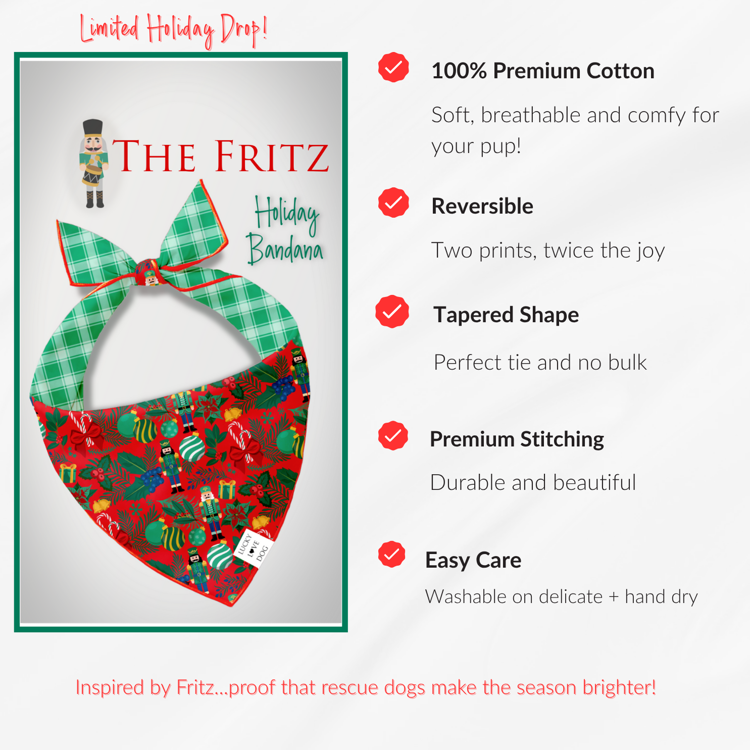 Inspired by Fritz — a once-forgotten rescue pup who reminds us that second chances shine the brightest. His joyful spirit sparked this festive nutcracker design, made to spread a little holiday magic wherever your pup goes.